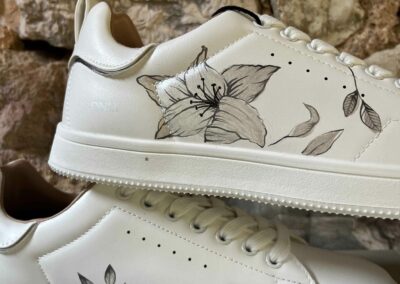 - Protection et finitions : Une fois la custom de vos chaussures et la personnalisation terminées, on passe à l’étape de la fixation. Un vernis protecteur est appliqué pour garantir la durabilité de votre design. Grâce à cela, vos sneakers seront prêtes à être portées au quotidien, tout en restant protégées des frottements et des intempéries.