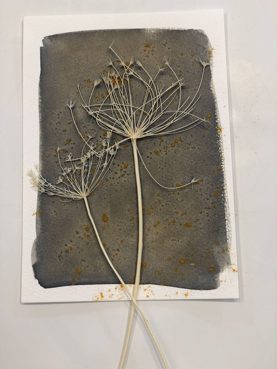 - Les différentes étapes : préparer la solution, imbiber le papier ( les précautions ), jouer avec les végétaux, exposition, rinçage ….